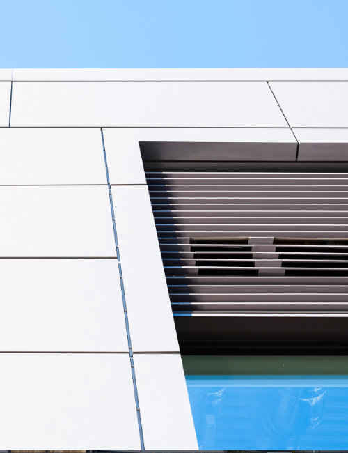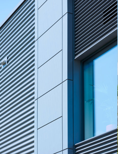 Our Slimwall™ flat panel system is available in aluminium, steel and Cor-ten and can be used either as a rainscreen or as a complete NON-COMBUSTIBLE insulated assembly.